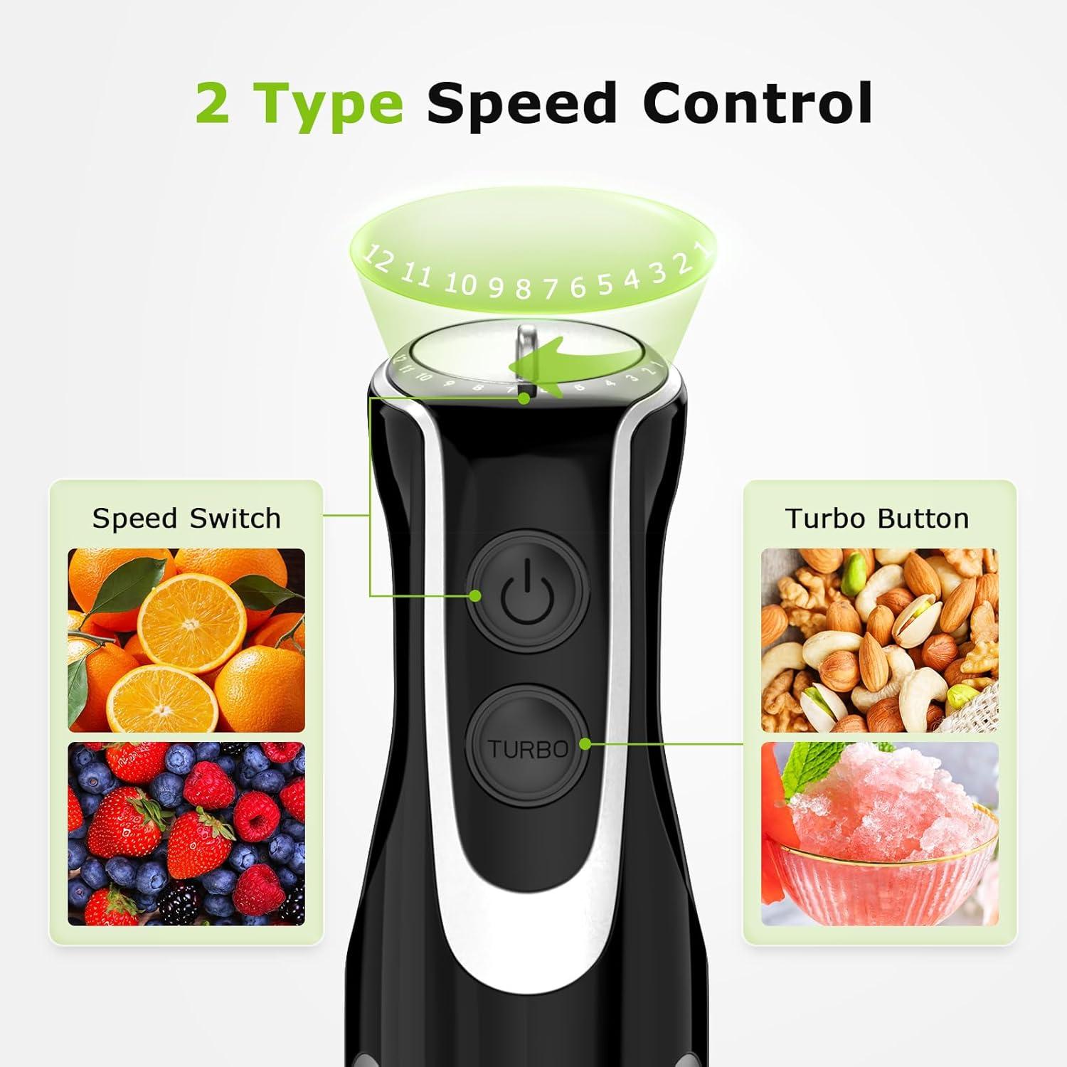 Powerful Motor for Fast, Smooth Blending Equipped with a robust 500-watt high-torque motor, variable 12 speeds and Turbo mode, this immersion hand blender delivers exceptional power and precise control. It effortlessly purees hard fruits and vegetables, and blends smooth soups, milkshakes, and baby food to a perfectly smooth consistency in seconds.