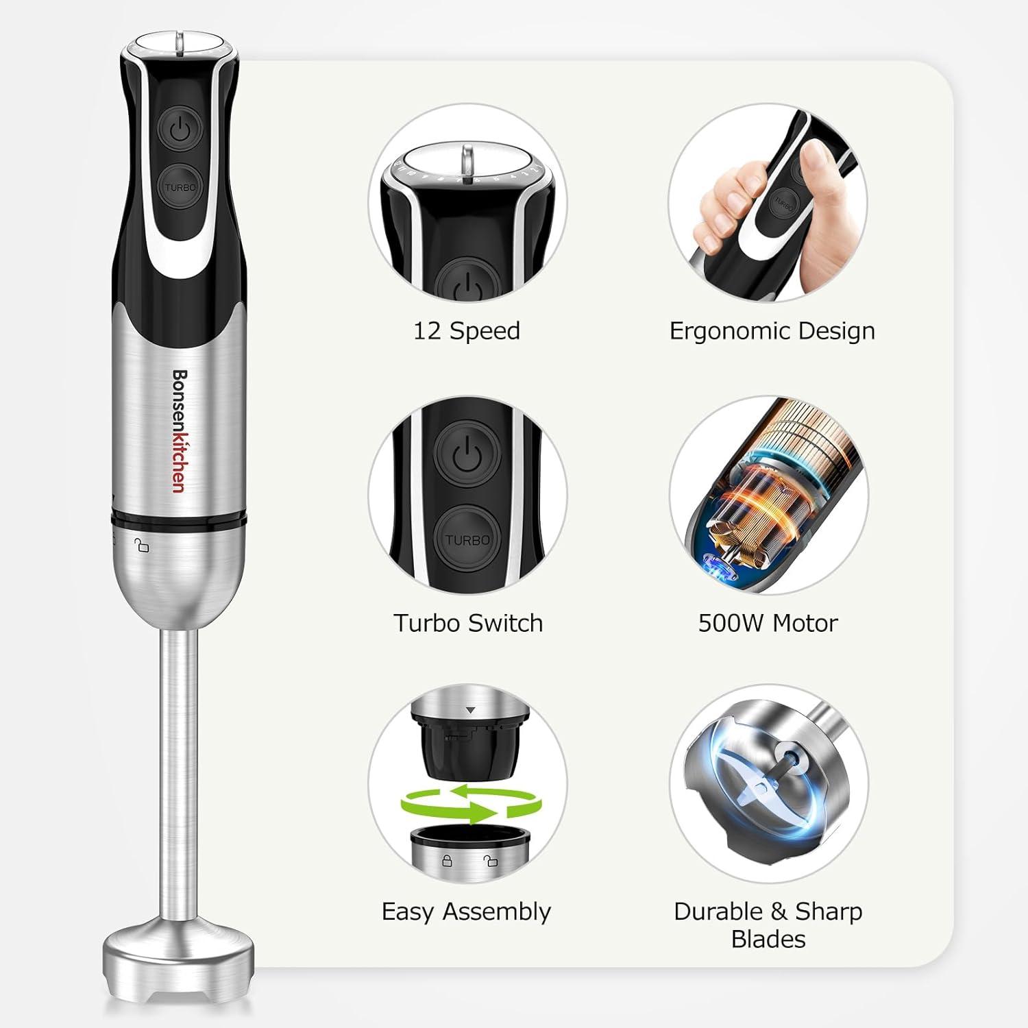 Bonsenkitchen 4-in-1 Immersion Blender Handheld with Food Processor, 12 Speeds Hand Blender with Turbo Mode, Stainless Steel Blade, Egg Whisk, Beaker & Chopper Bowl, Stick Mixer for Smoothie, Puree(12 speeds)