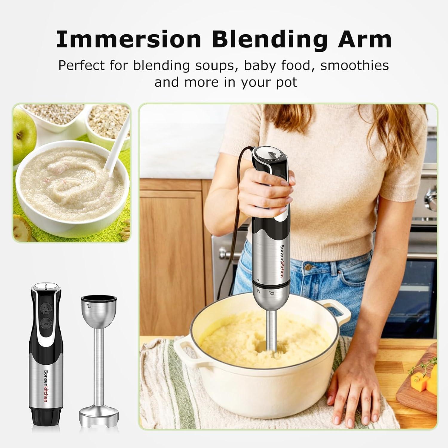 4-in-1 Multifunctionality for Complete Kitchen Tasks This Bonsenkitchen immersion blender handheld is your all-in-one kitchen solution. The 4-in-1 hand blender set includes a powerful blending shaft, an egg whisk, a 24oz mixing beaker cup, and a 17oz food chopper bowl. Effortlessly tackle a wide range of recipes with this hand immersion blender.